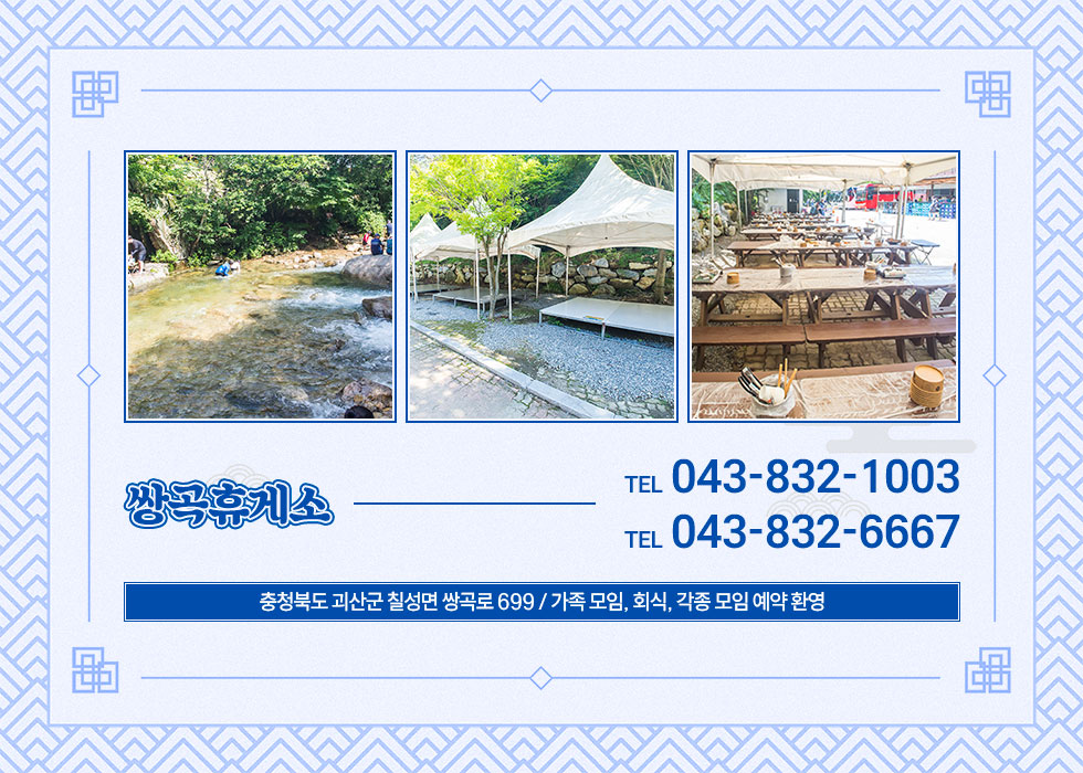 쌍곡휴게소 / 대표 : 최순덕 / 사업자등록번호 : 725-25-01101 / 주소 : [28021] 충북 괴산군 칠성면 쌍곡로 699 쌍곡휴게소가든 개인정보관리책임자 : 이문호 / Contact smcpro@naver.com for more information.